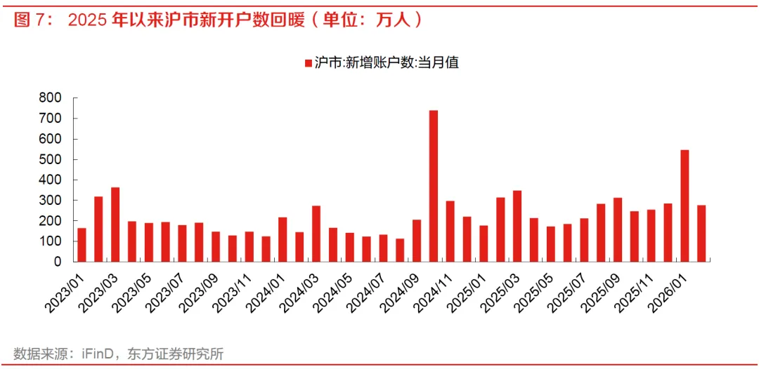 2025年以来,沪市新开户数整体呈回暖趋势,投资者参与度边际提升。虽然2024年9月曾出现单月脉冲式放量,但从2025年全年来看,新开户数中枢较此前已有明显抬升,尤其2025年下半年改善更为突出,市场情绪修复正逐步从存量交易扩散至新增投资者入场。2025年1月至2026年2月月均开户数为273.5万户,较2024年前8月的163.9万户有明显提升。开户数据的回暖意味着资本市场吸引力提升,也为券商经纪客户扩容、两融转化及财富管理业务增长提供了增量基础。