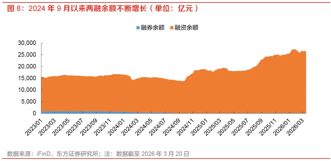 自2024年9月以来,两融余额总体保持上行,杠杆资金持续回流市场。两融余额在2024年三季度末触底后进入趋势性增长通道,2025年下半年以来增长幅度进一步加快,并在2026年1月28日到达27,426.1亿元的高位。两融余额持续扩张一方面反映风险偏好修复和活跃资金回归,另一方面也直接提升券商信用业务收入,是本轮券商基本面改善的重要支撑之一。我们认为伴随地缘冲突的边际缓和,风险偏好有望逐步迎来修复,在此背景下,中国资产在全球的吸引力也有望持续提升,因此两融余额有望同步迎来趋势性扩张。