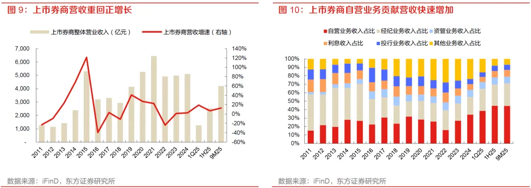 2024年以来,上市券商营收已重新进入修复通道。43家A股上市券商2024年实现营业收入5,104.44亿元,同比增长2.4%,结束此前连续两年的负增长;进入2025年后,行业收入进一步修复, 9M25营业收入为4,202.51亿元,同比增长12.9%。整体看,当前券商业绩已由前期底部企稳逐步转向温和扩张,收入端修复节奏总体向上,为后续利润改善提供了基础支撑。