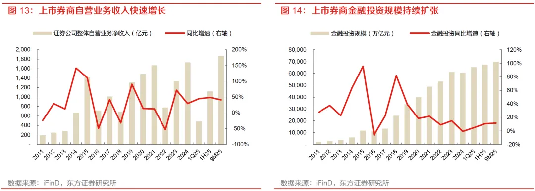 金融投资规模持续扩张,为自营收入增长提供了资产基础。上市券商金融投资规模由2024年的6.07万亿元升至9M25的6.99万亿元, 9M25同比增长11.5%。