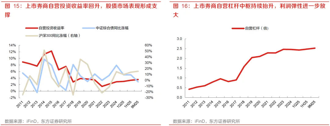 自营杠杆中枢继续抬升,进一步放大了利润弹性。上市券商自营杠杆由2024年的2.46倍升至9M25的2.53倍,已处于近年来相对高位。整体而言,在投资规模扩张和收益率修复之外,杠杆提升也是推动自营收入高增的重要放大器。