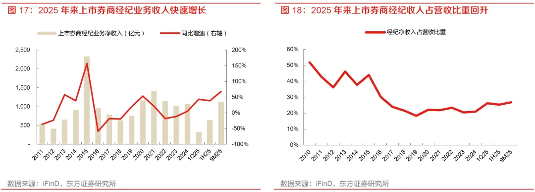 分业务看,本轮券商业绩修复主要由自营和经纪两条主线驱动。自营业务方面,9M25上市券商自营收入达1,632亿元,同比增长37.1%,既有金融投资规模扩张带来的业绩提升,也有投资收益率回升和杠杆中枢抬升的共同支撑。经纪业务方面,9M25年行业经纪收入1,126亿元,同比增长68.0%,收入占营收比重提升至26.8%。尽管佣金率仍延续下行,但在成交额中枢抬升背景下,经纪业务已重新成为行业收入修复的重要支撑。