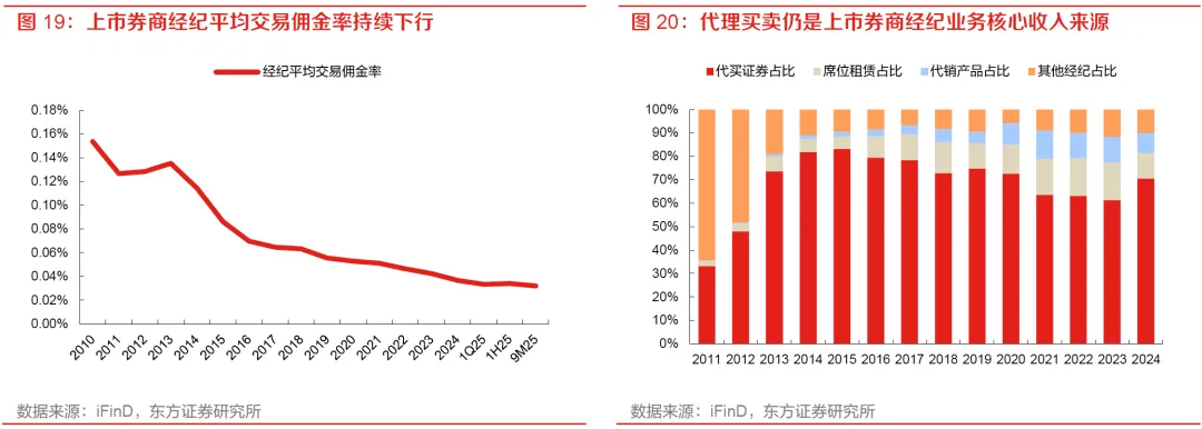 尽管经纪收入显著改善,但佣金率中枢仍延续下行趋势,行业增长仍主要依赖“以量补价”,重点关注市场活跃度提升而带来的交易量提升。2024年行业经纪平均交易佣金率已降至0.037%, 9M25进一步下降至0.032%,我们认为价格竞争和费率下行压力仍在。收入结构上,代理买卖业务始终是经纪条线最核心的收入来源,2024年占比约70.6%,席位租赁、代销金融产品和其他经纪业务占比分别为10.9%、8.4%和10.1%;整体来看,当前经纪业务短期弹性主要仍来自成交放量,其次是竞争格局的改善。