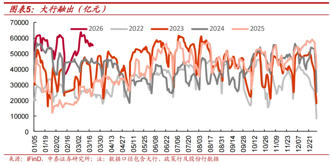 大行融出日均环比小幅下行。3月16日-3月20日大行融出规模合计27.84万亿元,单日最高融出规模5.7万亿元,日均融出规模5.6万亿元,环比前一周日均值下行0.37万亿元。