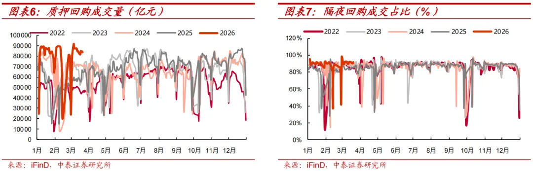 质押式回购交易量下行。日均成交量为8.37万亿元,单日最高达8.50万亿元,较上周日均值下行2.29%。隔夜回购成交占比上行。日均占比为91.3%,单日最高达92.1%,较前一周的日均值上行0.18个百分点,截至3月20日位于97.6%分位数。