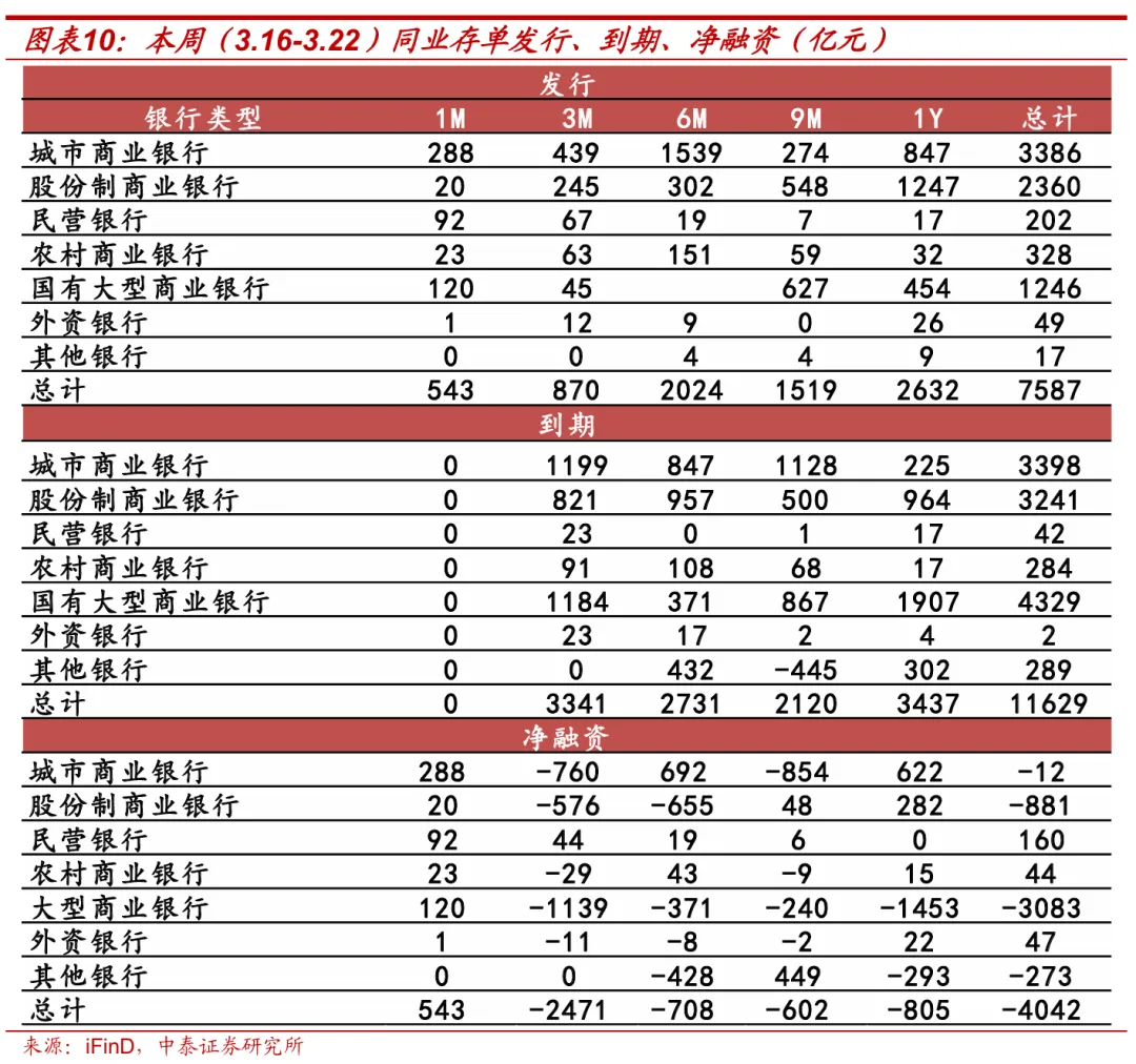 本周(3.16-3.22,下同)同业存单发行规模环比减少,净融资额为负。总发行量为7586.9亿元,较上周减少872.0亿元;到期总量11628.6亿元,较前一周增加1546.6亿元。净融资额为-4041.7亿元,较上周减少2418.6亿元。