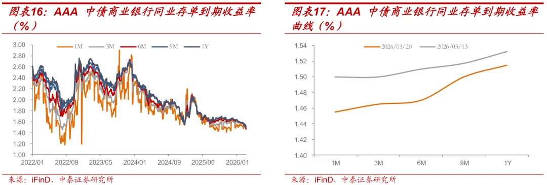 本周存单到期收益率曲线整体下移。截至3月20日,评级为AAA的中债商业银行同业存单1M、3M、6M、9M、1Y到期收益率分别为1.46%、1.47%、1.47%、1.5%、1.52%,较3月13日分别变动-4.5BP、-3.5BP、-4BP、-1.75BP、-1.75BP。