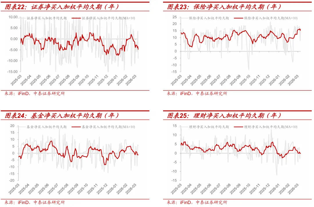 基金净买入久期环比下降,保险久期小幅下行。截至3月20日,基金净买入加权平均久期(MA=10)为-1.23年,较3月13日的1.23年下降,位于15%的历史分位数水平;理财净买入加权平均久期(MA=10)为-0.08年,较3月13日表现下降,位于38%的历史分位数水平;证券净买入加权平均久期(MA=10)为-4.73年,较3月13日表现下降,位于5%的历史分位数水平;保险净买入加权平均久期(MA=10)为15.72年,较3月13日表现下降,位于99%历史分位数水平。