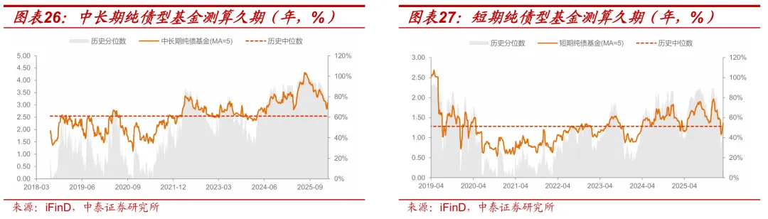 中长期纯债基金久期环比小幅回升。截至3月20日,中长期纯债型基金较3月13日回升0.01年至3.03年,位于2025年以来11%历史分位数水平;短期纯债型基金较3月13日回升0.17年至1.48年,位于2025年以来41%历史分位数水平。