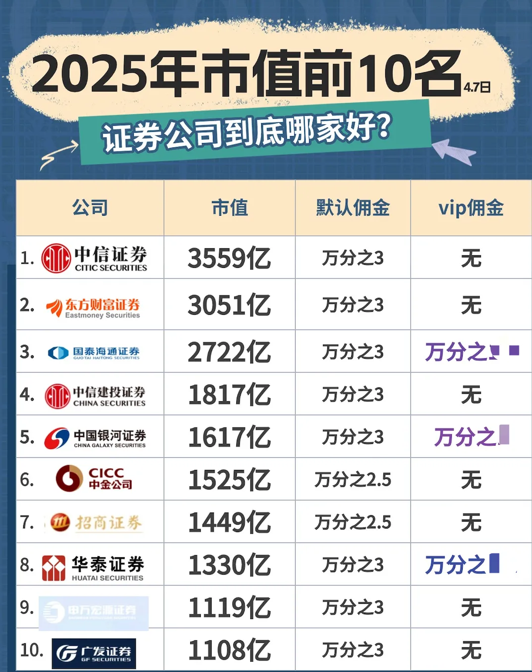 要是主要为了炒股,那佣金高于万分之 2.5 的券商,基本可以排除了,不然交易成本太高,真的不划算。