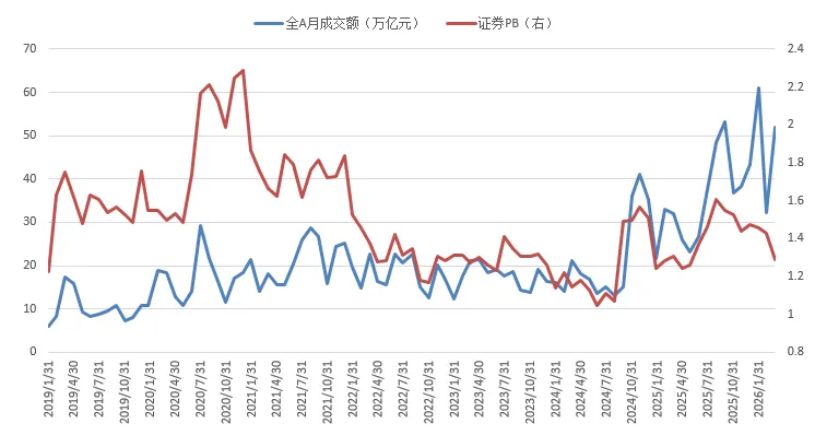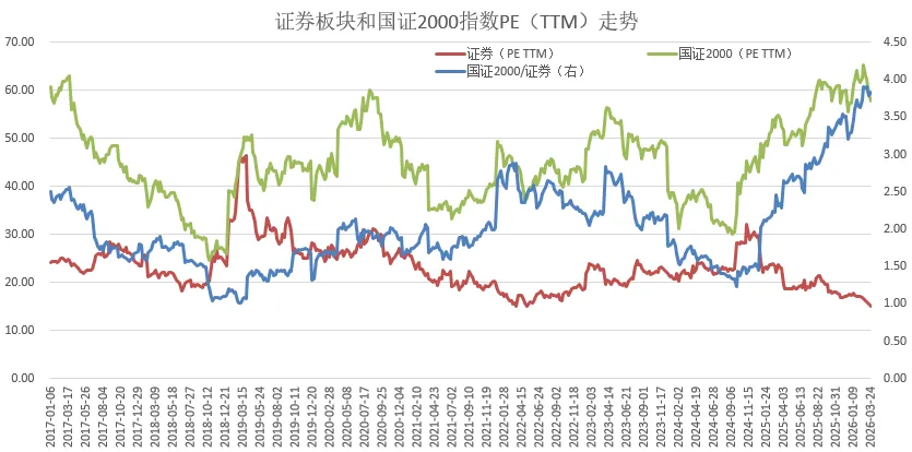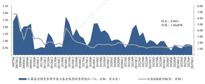 券商板块在跌什么?从近十年数据来看,二者ROE水平相当,近两年券商领先。2024年11月以来,券商板块PE持续杀跌并创10年新低,国证2000指数PE持续上涨并创10年新高,国证2000相对券商的估值从1.2倍直接涨到接近4倍,与二者盈利表现完全相反,这到底在隐含什么预期?风险偏好不能解释,宏观盈利好转也不能解释,难道是大熊市预期?还是券商板块经营生态恶化?2025年9月以来,券商板块PB从1.6倍跌至目前1.3倍,期间A股平均月成交额在40-50万亿元,今年1月单月突破60万亿元,成交额是券商重要的盈利因子;此外,主要宽基指数都是高位震荡。在这个背景下,券商短期业绩并无负面冲击,指数创纪录的连续下跌10周实在不好理解。根据研报统计,截至2025年末,公募基金股票投资中券商及互金板块持仓 0.69%,处于严重低配状态,缺乏持续砸盘能力。