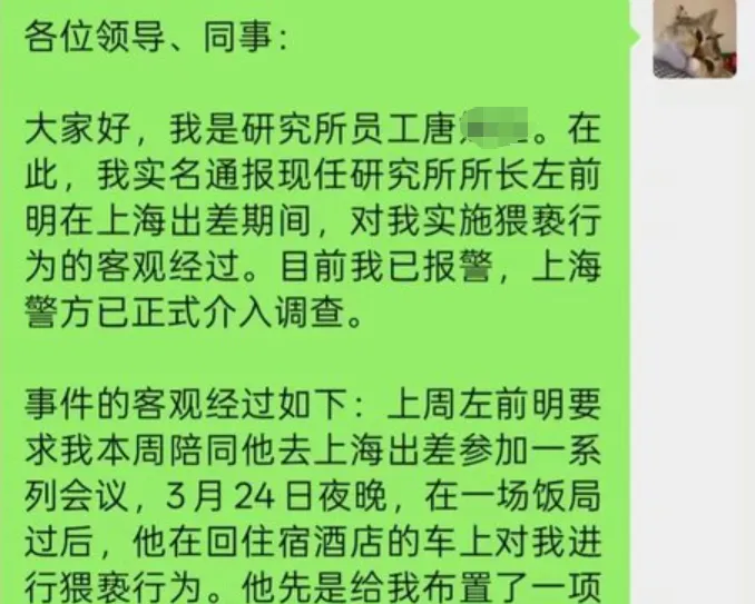 日前,金融圈曝出“大瓜”:自称为信达证券研究所员工的唐某某实名举报该研究所所长左前明在上海出差期间对其进行猥亵。唐某某称她已报警,上海警方已正式介入调查。