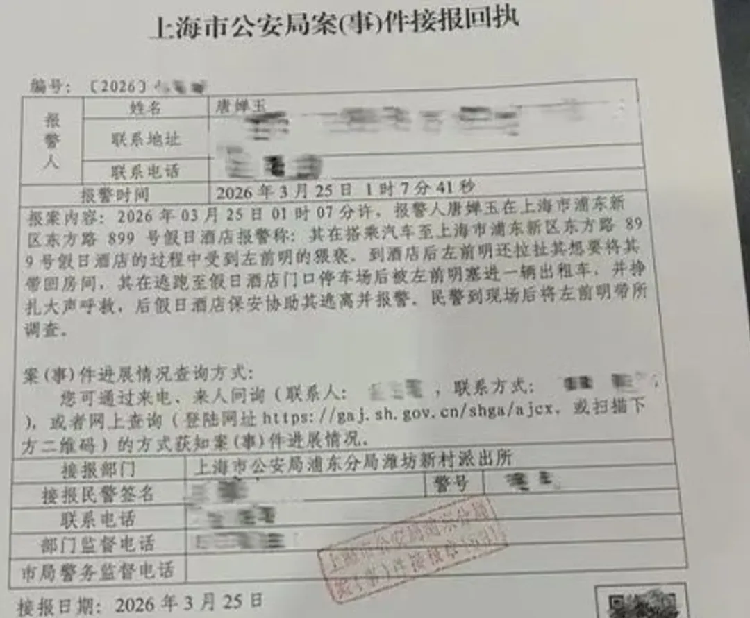 唐某某晒出了上海市公安局的案件接报回执。报案内容记录,报警人唐某某于2026年3月25日凌晨1时7分41秒报警,称在乘车前往浦东新区东方路899号假日酒店途中遭左前明猥亵,到店后,对方持续拉扯,欲将其带回房间,其在酒店门口停车场被塞入出租车后挣扎呼救,后由假日酒店保安协助离开并报警,民警到场后将左前明带走调查。