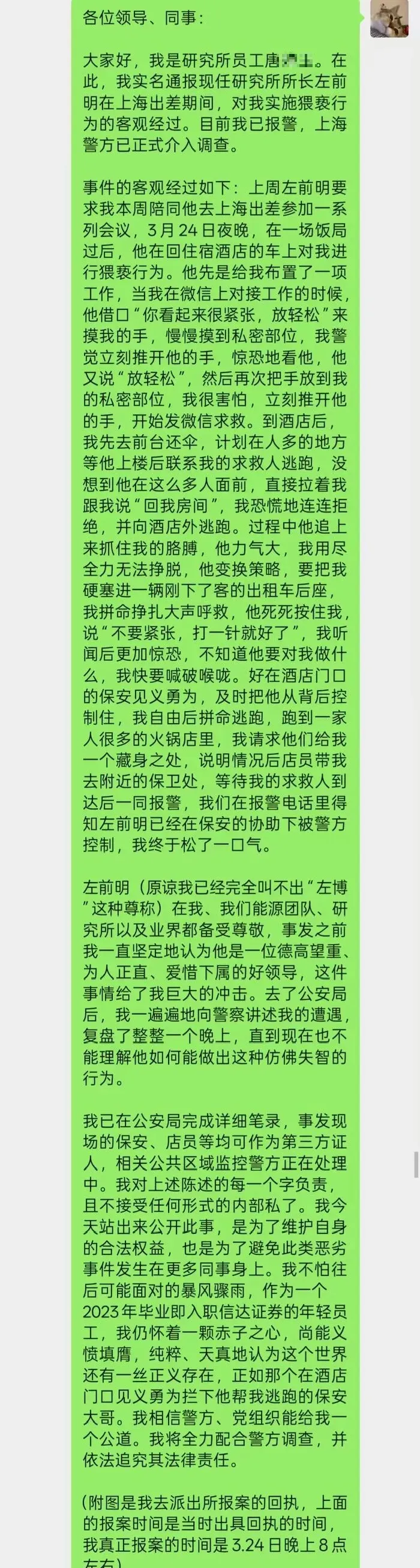 2026年3月25日,某券商研究所女员工唐某在工作群里实名检举出差期间被领导猥亵全过程。举报内容栩栩如生,具有很强的画面感。