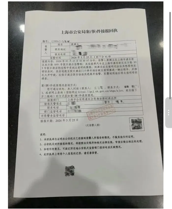女员工唐某还晒出了报案回执,报案地点是上海市公安局浦东分局潍坊新村派出所,报案时间是2026年3月25日凌晨1时7分41秒。