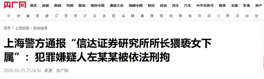 2026年3月25日,央广网消息,信达证券(601059.SH)研究所所长左前明被女下属实名举报猥亵一事引发广泛关注。当日晚7时许,上海市公安局浦东分局通过官方微博发布通报,犯罪嫌疑人已被警方依法刑事拘留。