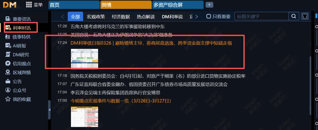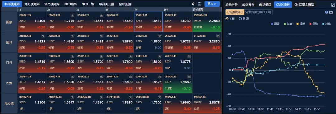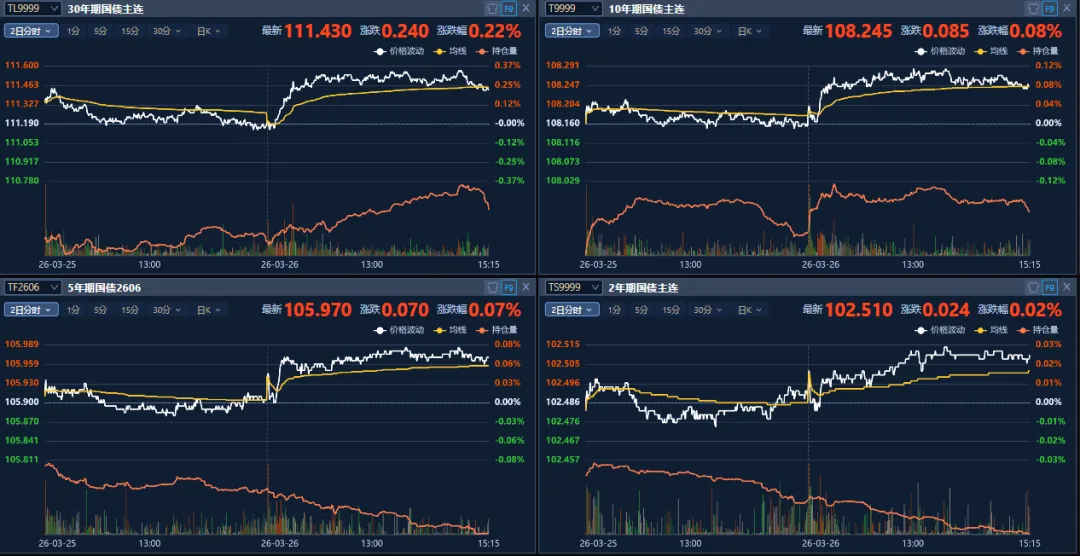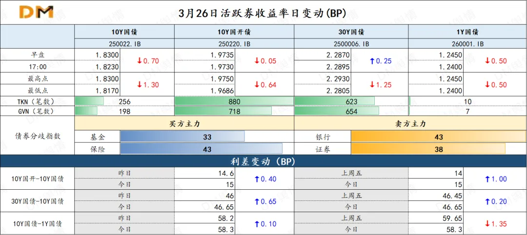 风险资产今日再度下跌,避险情绪下,债市行情虽较昨日明显好转,但长端仍难言强势,短债表现更优,季末资金面持续强韧,支撑中短端走强,3-5Y现券多数下行1BP左右,长债盘初一度快速走强,随着基金做多力量走升,午后涨幅缓步扩大,10Y新券下至1.81%下方,30年期国债期货主力合约盘中突破20日均线至111.58,尾盘券商情绪转空,债市涨幅收窄,机构预测不排除周末之前债市提前进行小幅避险,建议波段思路应对、谨慎追涨。