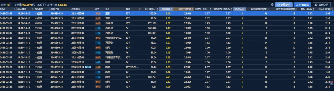 今日吉林、海南两地共发行16只地方债,其中吉林30年期专项债出现极高边际倍数(最高超215倍),显示博取边际情绪集中,但全场倍数普遍在18-24倍之间,整体需求平稳,利差水平未见异常。详情如下: