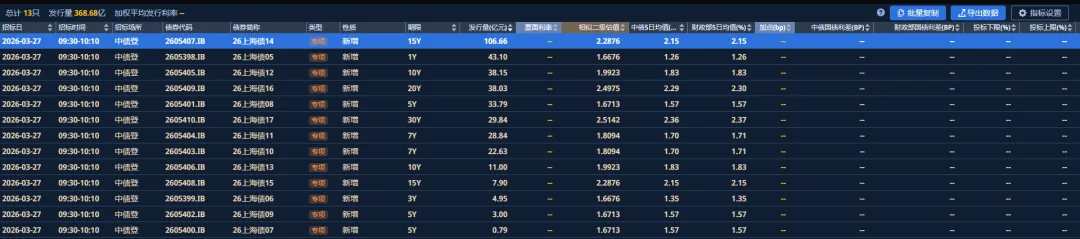 下一交易日上海将发行13只地方债,发行量 368.68亿,详情如下: