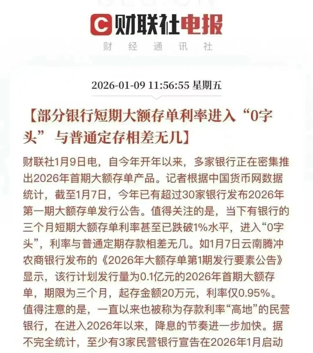 与此同时,银行存款正悄然“缩水”。2026年初,多家银行陆续发行新一期大额存单,但部分利率甚至降至“0字头”,与普通定期存款相差无几。“存款搬家”也因此成为当前最受关注的财经话题。