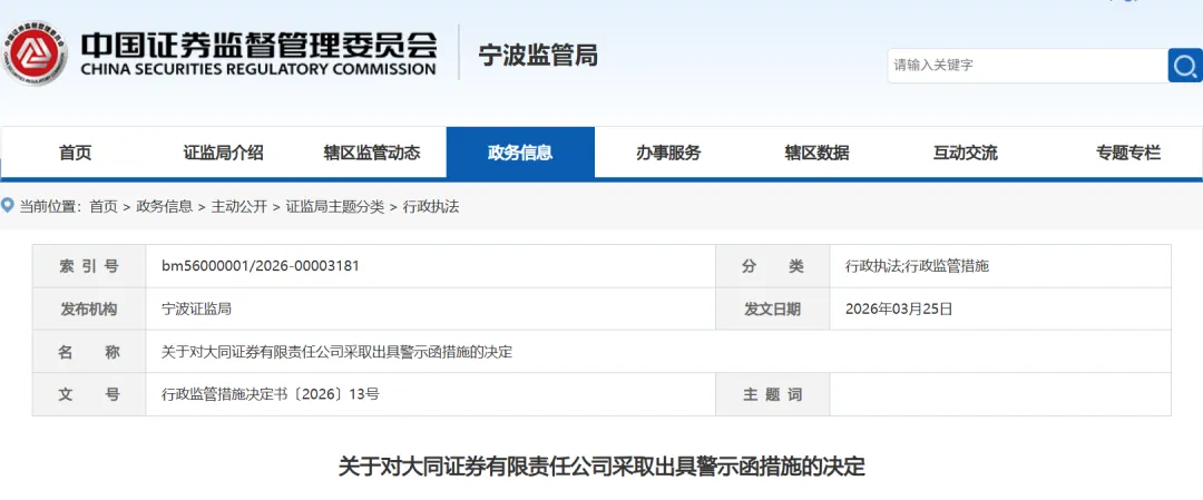 2026年3月25日,宁波证监局发布《关于对大同证券有限责任公司采取出具警示函措施的决定》。公告显示,3月23日,宁波证监局对大同证券有限责任公司采取出具警示函的行政监管措施。原因是大同证券作为公司债券“H23欣捷1”的受托管理人,在受托管理期间,未对发行人未披露相关债务逾期事项保持必要关注,未在2025年年度受托管理事务报告中披露相关债务逾期事项,未能采取有效措施督导发行人履行信息披露义务。该决定已记入证券期货市场诚信档案数据库。