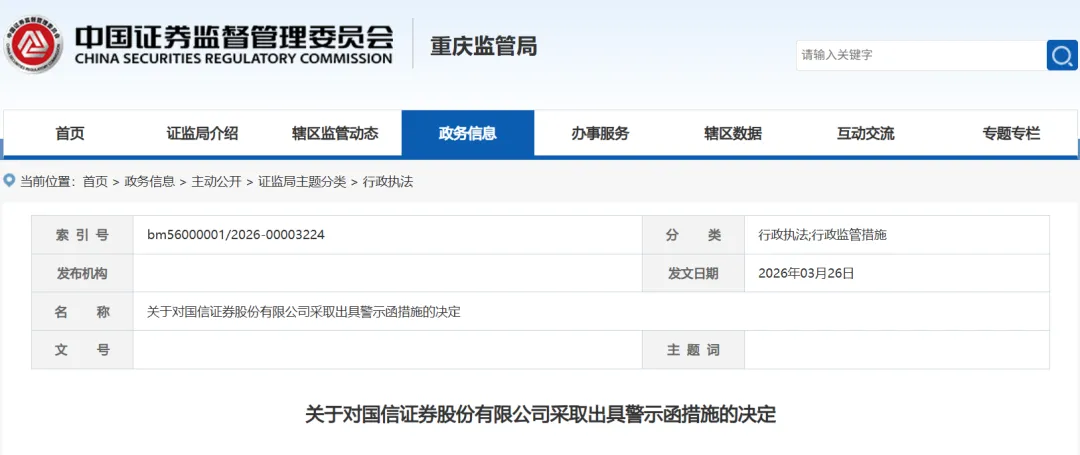 2026年3月26日,重庆证监局发布《关于对国信证券股份有限公司采取出具警示函措施的决定》。公告显示,3月10日,重庆证监局对国信证券股份有限公司采取出具警示函的行政监管措施,并记入证券期货市场诚信档案。原因是在作为公司债券受托管理人期间,国信证券存在未勤勉尽责履行债券募集资金使用监督职责的情形。公司需在收到决定书之日起30日内提交书面整改报告。