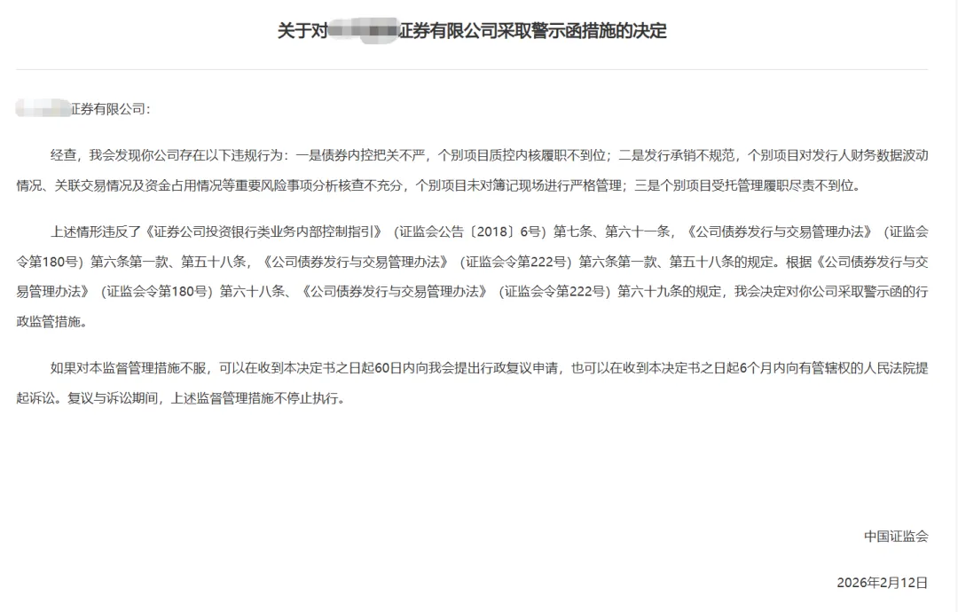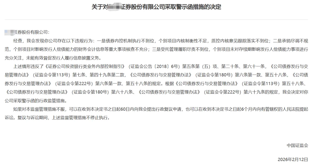 3家券商同日领警示函!债券业务成重灾区监管从严常态化背景下,券商投行业务合规底线再受冲击。2026年2月12日,中国证监会同日对T证券、Z证券、C证券三家机构出具警示函,直指其债券相关业务存在多项违规行为,为全行业敲响合规警钟。作为资本市场“看门人”,券商投行业务的合规性直接关系到市场秩序与投资者权益。结合近期监管动态来看,投行业务已成为罚单重灾区,尤其债券业务的内控、承销、受托管理等环节,更是监管抽查的重点领域。此次被罚的三家券商,违规行为虽各有侧重,但均聚焦于债券相关业务,且呈现出“内控薄弱、履职缺位”的共性问题,具体违规细节如下:T证券的违规行为覆盖债券内控、受托管理及ABS业务三大领域:一是债券内控把关不严,个别项目对质控内核提出的意见回复不到位,内核未实现闭环管理,相当于“自查整改流于形式”;二是个别公司(企业)债券受托管理履职缺位,未充分关注存续期内影响发行人偿债能力的关键事项,未能发挥持续督导作用;三是个别ABS项目基础资产转让核查不充分,且在存续期内未持续跟踪核心企业经营情况,忽视了资产证券化业务的底层风险。Z证券的违规集中在债券内控与发行承销两大环节:一方面,债券内控把关不严,个别项目质控内核履职不到位,内控机制未能有效发挥制衡作用;另一方面,发行承销环节不规范,不仅对发行人财务数据波动、关联交易、资金占用等重要风险事项分析核查不充分,还存在个别项目簿记现场管理不严格的问题,违背了承销业务的合规要求。3. C证券:内控执行、承销尽调、受托管理均有短板C证券的违规表现同样暴露了多环节漏洞:一是债券内控机制执行不到位,个别项目内核制衡性不足,质控内核意见的跟踪落实不到位,内控流程“形同虚设”;二是承销尽职调查不规范,对影响发行人偿债能力的财务会计信息等重大事项核查不充分,未能提前识别潜在风险;三是受托管理履职尽责不到位,未充分关注存续期内发行人偿债能力相关事项,也未有效督促发行人履行信息披露义务,损害了投资者的知情权。梳理三家券商的违规行为,结合近期监管处罚趋势不难发现,债券业务的“内控管理、尽职调查、受托管理”已成为监管高压区:三家券商均存在“债券内控把关不严”的问题,要么是质控内核履职不到位,要么是内核意见跟踪落实不力,核心症结在于内控机制未能形成闭环。监管层面明确要求,券商需建立与业务规模、复杂程度相适应的内部控制体系,而此次被罚案例表明,部分券商的内控流程仍停留在“表面”,未能真正实现“自查—整改—复核—完善”的闭环管理,这也是近年来监管处罚的高频要点之一。作为券商投行业务的核心环节,尽职调查是防范风险的第一道防线,而部分券商为追求业务进度,忽视了对发行人财务状况、关联交易、底层资产等关键信息的核查,最终触碰监管红线——这一问题在近期多家券商被罚案例中均有体现,已成为行业共性短板。受托管理是债券业务的“后半程”关键环节,监管要求券商需持续跟踪发行人情况、及时披露风险,但部分券商存在“重承销、轻受托”的倾向,导致受托管理沦为“走过场”,这也是监管重点整治的违规行为之一,此前L证券等机构也曾因受托管理履职不到位被罚多家机构也因同类问题被罚。值得注意的是,受托管理缺位不仅会被监管处罚,还可能因发行人违约导致券商承担连带赔偿责任,损害机构声誉与投资者信任,这一点必须引起全行业高度重视。一方面,要加强对项目全流程的内控审核,从项目立项、尽调、承销到受托管理,每一个环节都需严格把关,杜绝“走过场”;另一方面,要建立内控考核与问责机制,对未落实内控要求、履职不到位的相关责任人进行追责,倒逼内控机制真正发挥作用。尽职调查是防范债券业务风险的核心,券商需摒弃“重进度、轻质量”的业务导向,全面提升尽调精细化水平。在承销及ABS业务中,要重点核查发行人财务状况、关联交易、资金流向、底层资产真实性等关键信息,对存在的风险隐患及时识别、审慎评估,坚决杜绝“带病申报”“带病承销”。同时,要加强尽调人员专业培训,提升其风险识别与分析能力,确保尽调工作落到实处、取得实效。券商需转变业务理念,将受托管理提升至与承销同等重要的位置,明确受托管理责任,细化受托管理流程。在债券存续期内,要定期跟踪发行人经营状况、偿债能力,及时关注可能影响债券兑付的重大事项,严格按照监管要求履行信息披露义务;对发行人存在的违规行为,要及时督促整改,必要时采取相应的风险处置措施,切实保护投资者合法权益。行业共勉:合规无小事,敬畏方始终。让我们以专业铸基、以合规立本,携手推动行业高质量发展。