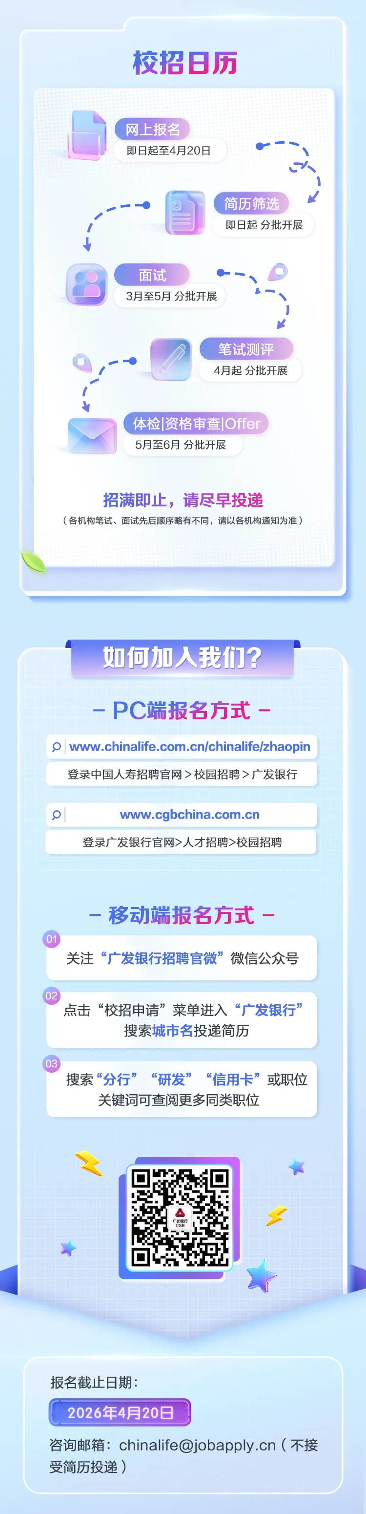银行券商 | 广发银行2026年度春季校园招聘点击上方"校招攻略",选择"设为置顶or星标"第一时间获取各大名企校招内推资源校招攻略渠道直推01 内推享受优先筛选,进度可查百度 史上最大规模实习,超九成与AI相关渠道直推|顺丰集团 2026届管培生春招渠道内推 | 大参林医药 2026春招渠道内推|招银网络科技 2026届春招安克创新 2026届春招渠道直推|美团 26届春招+27届转正实习渠道直推|库洛游戏 2026届春招渠道直推|Shopee 2026届春招米哈游 2026届春招渠道直推|米哈游 全年实习生招聘项目渠道内推 | 高途 2026春季校招渠道内推 | 迅雷 2026届春招渠道直推|TCL华星2026届春招渠道直推|拼多多2027届研发实习生招聘渠道直推|9377游戏 2026届春招渠道直推|友塔游戏 2026春季校园招聘渠道直推|好未来 2026春季校园招聘渠道直推|作业帮 2026春季校园招聘渠道直推|凡岛 2026春季校园招聘渠道内推|康冠科技 2026届春季校园招聘帆软 2026届春招内推 <<点击上方文字即可跳转 >>