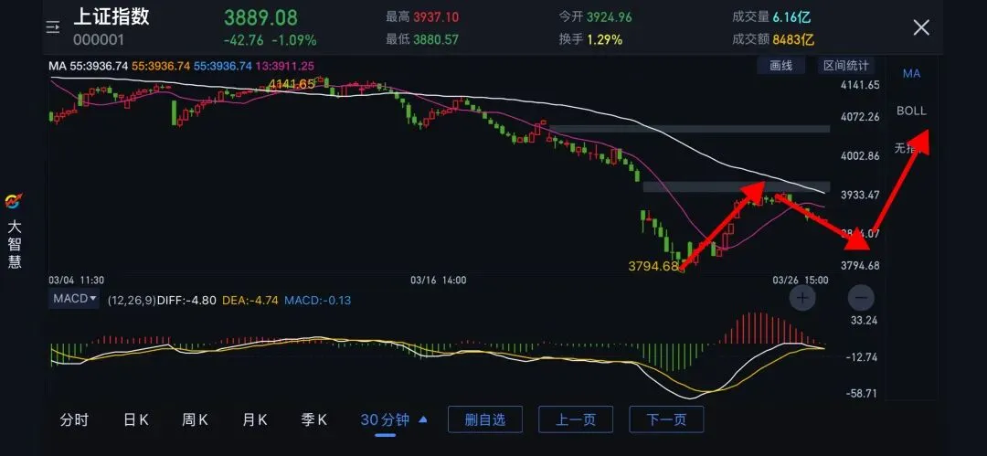 20260326上证指数分析+券商指数跟踪上证指数有所回落,属正常调整,没有太过担心。日线图反弹大概率没有结束,今天的回落仅々是反弹过程中的调整。30分钟图大概率是N形之BC,这个位置的压力,其实不难理解。上方有缺口,外加均线。另外这彼反弹可能刚好对上日线的4浪,而4浪往々是ABC结构。当然,如果去创新低,那么多个级别底背离钝化会出现。券商指数30分钟图不多不少,未出新低。但一出新低,就又是出底背离钝化,后续结构形成,又是机会。祝大家交易成功🏆