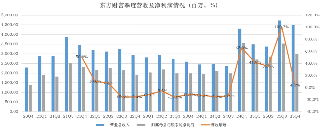 但是,从2025年四季度来看,东财的收入仅增长了4%,而净利润大幅下降16%: