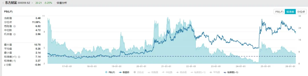 由于东财业绩波动较大,因此市场普遍采用市净率估值法,即每股股价与每股净资产的比率。