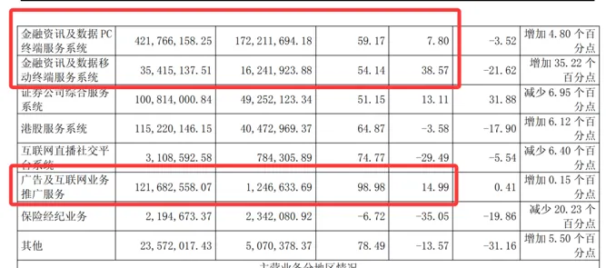 从财报来看,优势业务受到挑战的还有东方财富。作为一家互联网财富管理综合运营商,东方财富的业务可分为证券、金融电子商务服务、金融数据服务三大板块。
