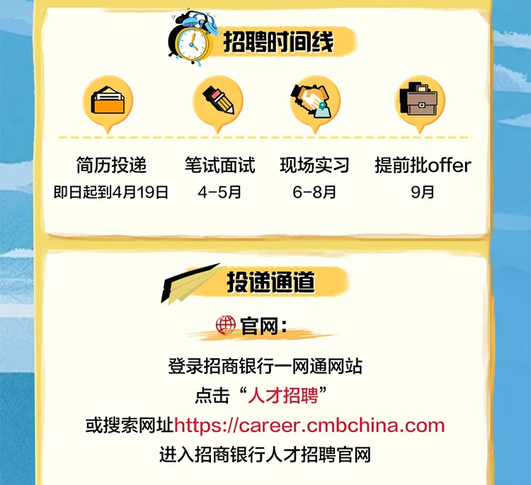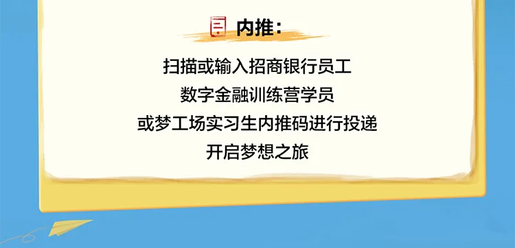 银行券商 | “梦工场”招商银行总行2027暑期实习生招聘点击上方"校招攻略",选择"设为置顶or星标"第一时间获取各大名企校招内推资源校招攻略渠道直推01 内推享受优先筛选,进度可查百度 史上最大规模实习,超九成与AI相关渠道直推|顺丰集团 2026届管培生春招渠道内推 | 大参林医药 2026春招渠道内推|招银网络科技 2026届春招安克创新 2026届春招渠道直推|美团 26届春招+27届转正实习渠道直推|库洛游戏 2026届春招渠道直推|Shopee 2026届春招米哈游 2026届春招渠道直推|米哈游 全年实习生招聘项目渠道内推 | 高途 2026春季校招渠道内推 | 迅雷 2026届春招渠道直推|TCL华星2026届春招渠道直推|拼多多2027届研发实习生招聘渠道直推|9377游戏 2026届春招渠道直推|友塔游戏 2026春季校园招聘渠道直推|好未来 2026春季校园招聘渠道直推|作业帮 2026春季校园招聘渠道直推|凡岛 2026春季校园招聘渠道内推|康冠科技 2026届春季校园招聘帆软 2026届春招内推 <<点击上方文字即可跳转 >>