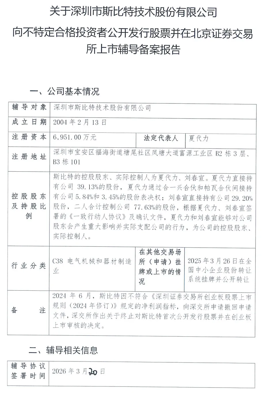 辅导备案报告显示,斯比特的控股股东、 实际控制人为夏代力、刘春宣, 二人合计控制公司 77.63%的股份。