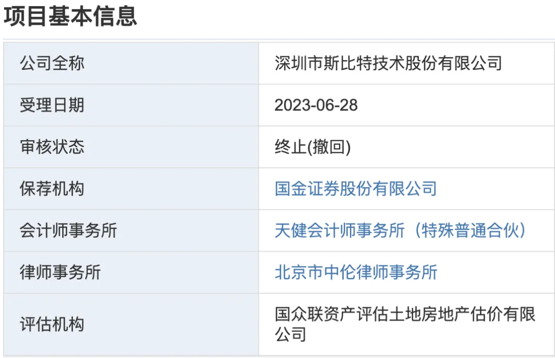 2023年6月,公司曾申报创业板IPO并获受理,中介机构为国金证券、中伦律所、天健会所,后因不符合条件, 向深交所申请撤回申请文件,2024年6月,深交所终止其创业板发行上市审核。