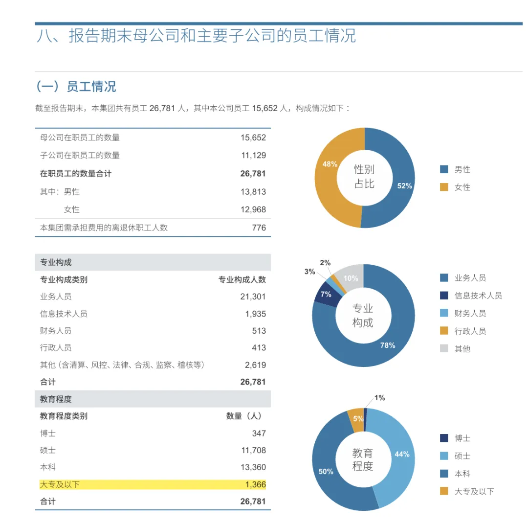 这反映出公司在数字化转型和合规风控上还在持续投入,人员向这些岗位倾斜。