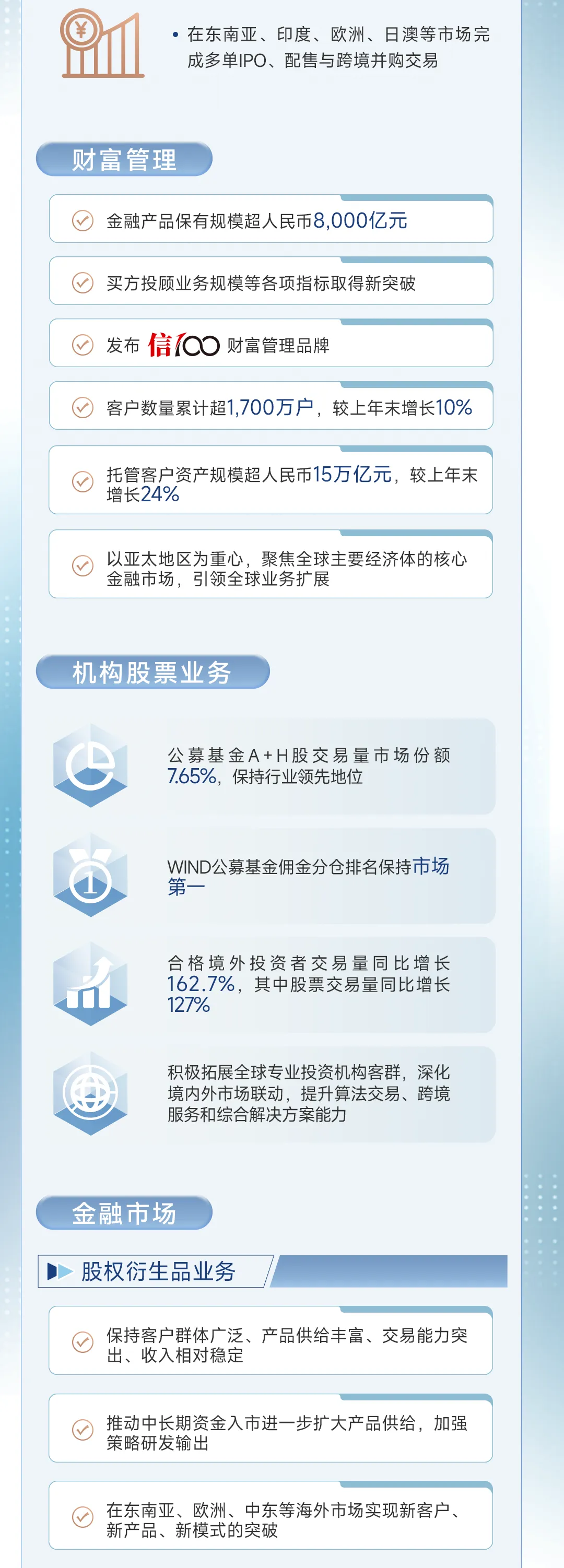 国际化:坚定不移地走出去,把香港业务做得更强,同时在中东、北美、东南亚寻找新机会,目标是成为真正的“国际一流投行”。