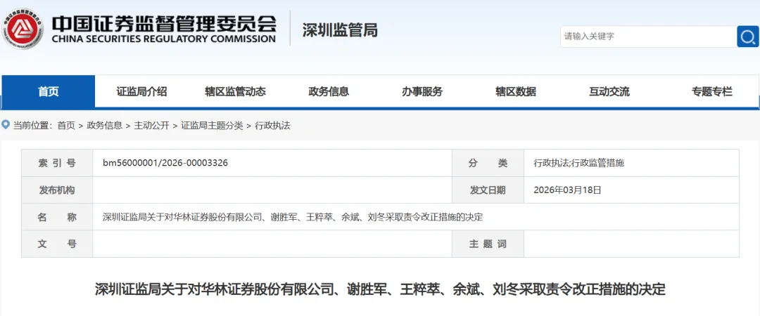 深圳证监局关于对华林证券股份有限公司、谢胜军、王粹萃、余斌、刘冬