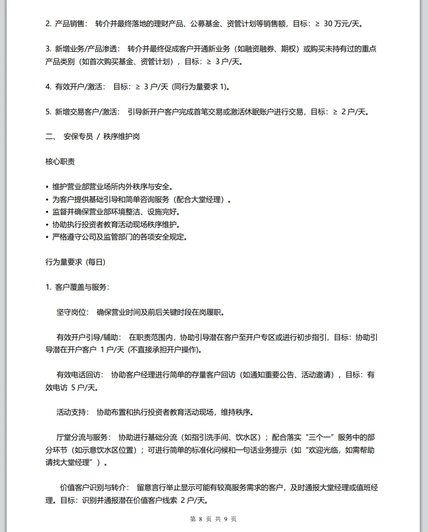 证券公司不是菜市场,岗位分工是底线。保安的核心是安全,大堂的核心是服务,强行让他们干销售,不仅专业度没了,还埋下一堆合规雷——无证展业、误导销售、客户投诉……哪样不是大问题?