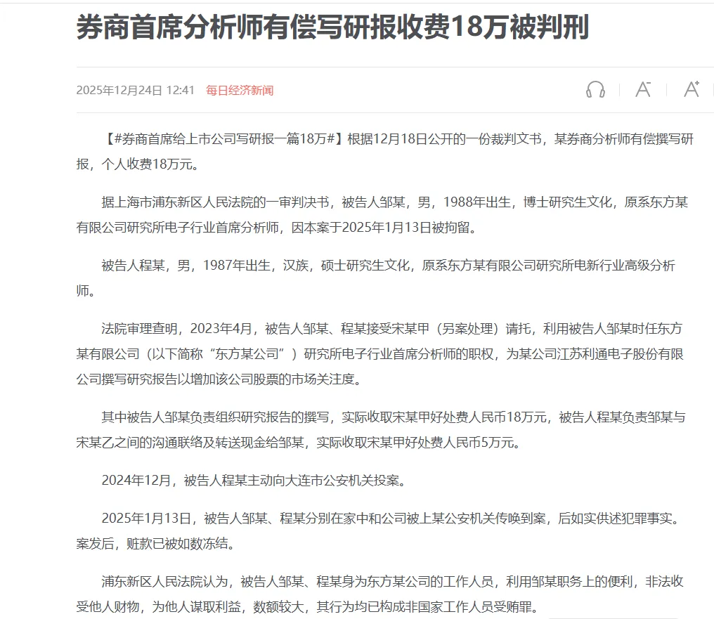 根据《每日经济新闻》报道,据上海市浦东新区人民法院的一审判决书披露,东方财富证券公司电子行业首席分析师收费18万元,撰写个股深度研究报告“有偿吹票”。
