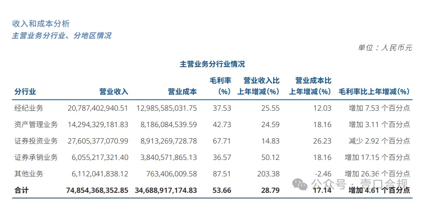 分业务收入来看,经纪、资管、证券投资、证券承销等主营业务均实现增长。其中经纪业务收入207.87亿元,同比增长25.55%;资产管理业务收入142.94亿元,同比增长24.59%;证券投资业务收入276.05亿元,同比增长14.83%;证券承销业务收入60.55亿元,同比增长50.12%。