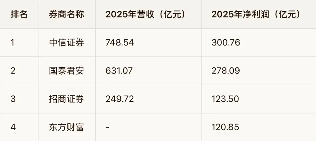 中信证券以748.54亿元的营收和300.76亿元的净利润稳坐行业头把交椅,其净利润规模甚至超过了部分中小券商的总营收。国泰君安(文中“国泰海通”疑为表述有误,应为头部券商国泰君安)以631.07亿元营收紧随其后,招商证券、申万宏源等老牌券商营收也均超过200亿元。