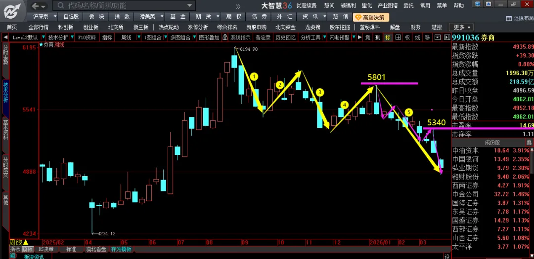 下周券商将会迎来一个重要的时间节点1、技术上,券商自6915开始的调整在日线、周线上均呈现的是“12345”的下行结构,其中“5”的下探在见到5165后就已完成、见图二,5165以下部分均属于技术性“超跌”部分,短期的压力位在5801的位置【备注:图一图二中黄色箭头部分】。2、券商“5”的下探【备注:5801开始的调整】在日线、周线上均出现“结构套结构”的走势,也呈现的是“12345”的下行结构,压力位在5340的位置。 需要说明一点----技术上,正是由于券商“5”的下探出现“结构套结构”的走势,才使得券商在见到5165后短期出现“超跌”的走势。3、月线上,此轮调整券商呈现的是“123”、“abc”的结构,其中“3”、“c”的调整也是在见到5165后就已完成,短期处也在技术性的超跌之中,压力位也在5801的位置,这一点日线、周线与月线同步。4、时间上,下周三周四是券商自6915调整以来的第144个交易日,这是一个重要的时间节点、也就是所谓的“变盘点”。也就是说,券商经过近8个月的调整将结束“4浪”的调整,从而进入到“5”的上涨之中。5、需要说明一点------券商周五盘中出现一个容易被忽略的积极信号。 技术上,尽管上周五券商低开、但并未创出新低,在日线上留下一个“双底”的“口子”,这是一个积极的信号,因此券商周一的走势就显得尤为关键。下周一,券商能否在没有创出新低的前提下向上拿下5036、并伴随着成交量的放大就成为我们关注的重点,这一步如果能够顺利完成意味着券商调整就此结束。6、日线上,券商短期的压力位在5036、5340的位置。下周开始,重点就是看券商在获得支撑后的上涨能否顺利拿下这两个压力位。技术上,可以将券商在获得支撑后的上涨见到5340作为券商调整结束得到确认的信号。