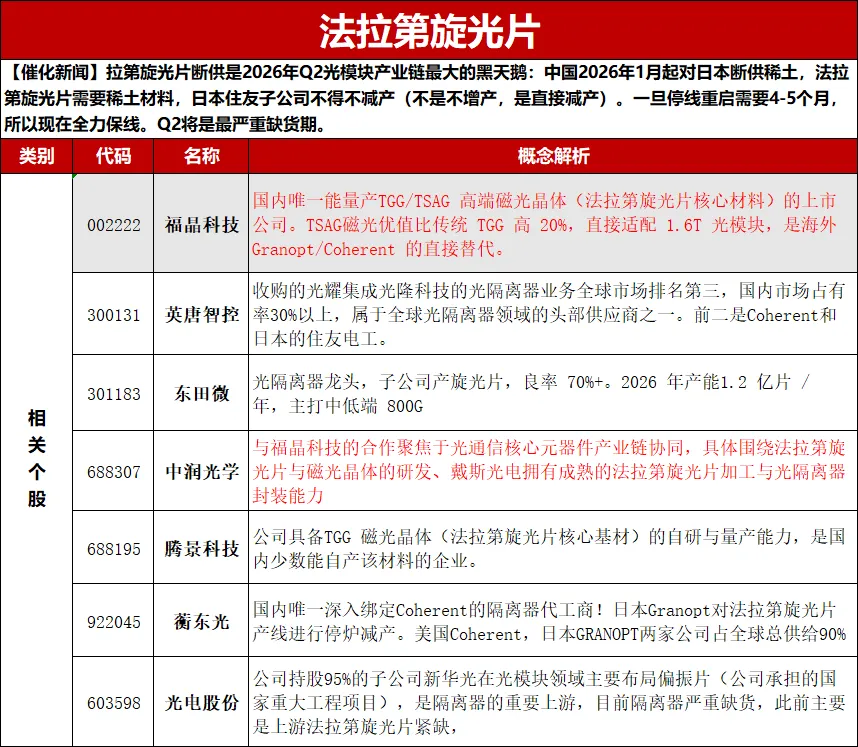受中国稀土出口管制政策影响,日本GRANOPT的衬底供应商SMM Precision面临严重的金属钆断供危机。由于稀土原料库存耗尽,GRANOPT被迫宣布从2026年1月起逐步减少生产,甚至对需要持续高温运行的法拉第旋光片产线进行停炉减产。一旦停炉,重新启动、晶体成长校准及工艺参数调试的周期长达6个月,这直接导致全球近30%的供给面临瘫痪重点关注