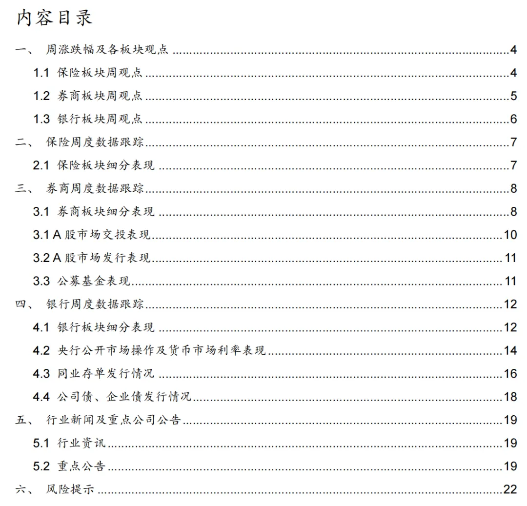 1)保险:推荐中国平安、中国太平、新华保险、建议关注中国太保,中国人寿(H);2)券商:推荐国泰海通、华泰证券、兴业证券、东方证券、广发证券、湘财股份、中金公司、东方财富、中信证券;3)多元金融:瑞达期货、香港交易所、远东宏信、中银航空租赁、易鑫集团,建议关注南华期货股份、渤海租赁、中国船舶租赁;4)银行:推荐杭州银行、中银香港(H),建议关注南京银行、厦门银行、宁波银行、青岛银行、徽商银行(H)、中信银行(H)、建设银行(H)、招商银行、上海银行、兴业银行、民生银行、平安银行。风险提示:政策风险、市场波动风险、利率风险、信用风险。