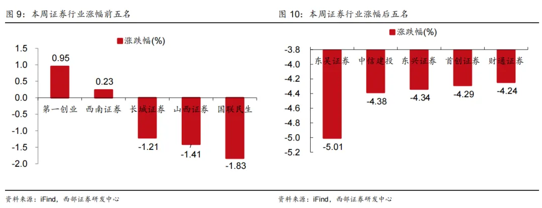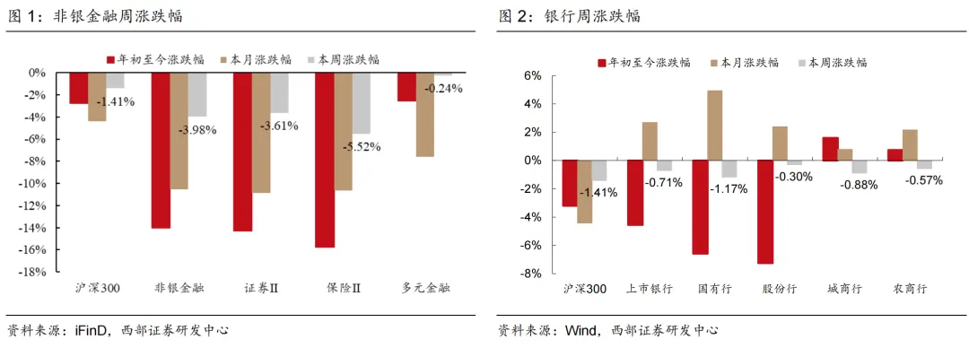 1)本周非银金融(申万)指数涨跌幅为-3.98%,跑输沪深300指数2.57pct。本周证券Ⅱ(申万)、保险Ⅱ(申万)、多元金融指数涨跌幅分别为-3.61%、-5.52%、-0.24%。2)本周银行(申万)涨跌幅为-0.71%,跑赢沪深300指数0.7pct。其中,国有行、股份行、城商行、农商行本周涨跌幅分别为-1.17%、-0.30%、-0.88%、-0.57%。