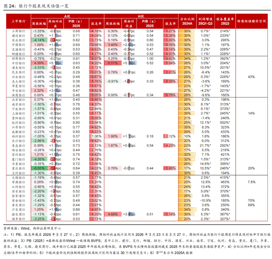 3)银行:本周银行(申万)涨跌幅为-0.71%,跑赢沪深300指数0.7pct。本周已有13家上市银行披露2025年年报,实现营收/归母利润同比增长0.85%/1.08%,样本银行经营基本面边际改善。展望2026全年业绩表现,银行净利息收入增速或企稳,财富管理类中收回暖债券估值收益拖累预计减弱,不良对公小幅改善、零售中位企稳。板块选股上我们推荐四条主线:具备盈利高弹性的优质城商行、高股息大行、具备转债强赎预期催化的银行,以及先前估值折价较多、后续有望依赖行业beta迎来补涨的股份行。