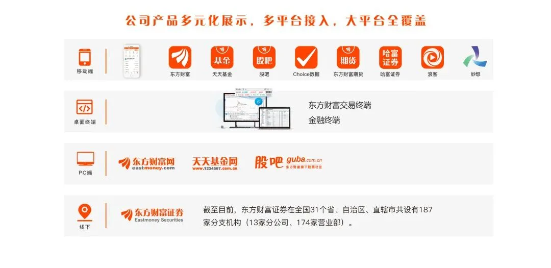 公司旗下现拥有“东方财富网”、“天天基金网”、“股吧”、“东方财富证券”、“Choice数据”、“哈富证券”、“东方财富期货”、“东财基金”等知名互联网产品及业务板块。其中公司运营的“东方财富网”于2004年上线,2007年“天天基金网”上线,2012年2月天天基金首批获得中国证监会颁发的基金销售牌照,截至2023年12月31日累计基金销售额超过10万亿元。自2015年至今,公司通过资本市场收购,全资控股了哈富证券、东方财富证券。2019年公司旗下东财基金获批公募基金牌照,公司迈向互联网财富管理领域,公司旗下子公司现已拥有券商牌照、期货牌照和公募基金牌照等。