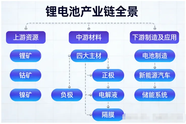 锂电池产业链全景:三大环节,四大主材。锂电池产业链清晰划分为上游资源、中游材料、下游制造及应用三大核心环节,其中中游四大主材(正极、负极、电解液、隔膜)是决定电池性能与成本的关键,合计占电芯成本超 70%。