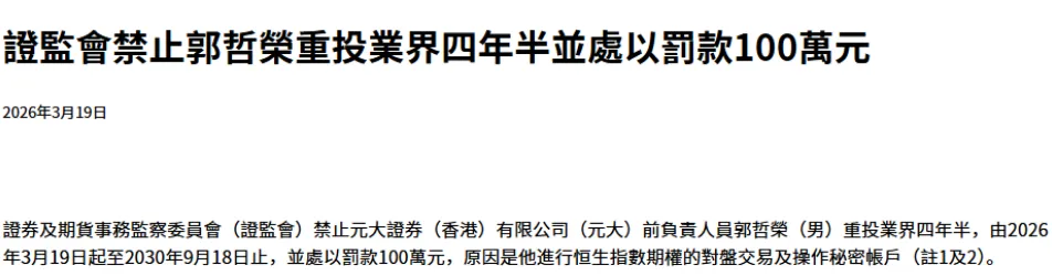 元大证券(香港)前负责人员郭哲荣,因严重违规被禁业54个月(四年半),并处以100万港元罚款。处罚期从2026年3月19日起至2030年9月18日止。